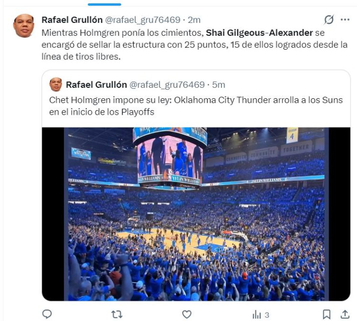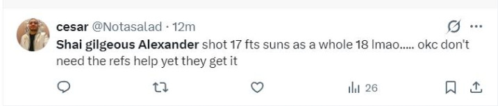 有雷霆球迷还为SGA找补,霍姆格伦为比赛奠定基调,最终亚历山大罚进15个球拿到25分,雷霆完成大胜。
