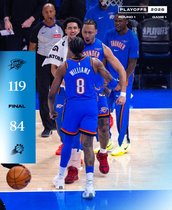北京时间4月20日,NBA季后赛首轮G1,俄克拉荷马雷霆以119-84狂胜菲尼克斯太阳。这是一场毫无悬念的比赛,雷霆首节就领先15分,半场拉开打21分,三节已经领先31分,末节直接进入垃圾时间。这就是联盟第一+卫冕冠军的统治力。
