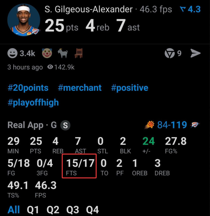 这场比赛亚历山大又引发了热议,他短短29分钟,18中5,三分4中0,罚球17中15,拿到25分7助攻4篮板2盖帽,命中率27.8%,三分命中率0%,真实命中率49.1%。