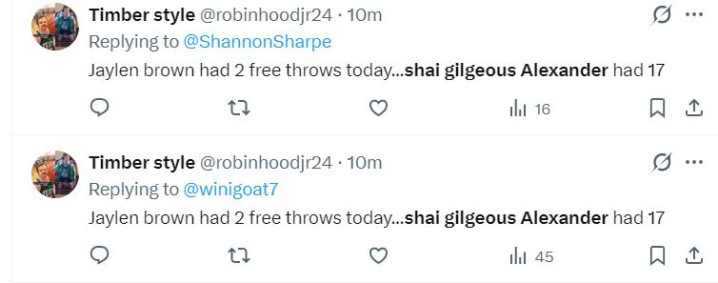 但更多的球迷都会说,这个比赛日杰伦-布朗2个罚球拿到26分,SGA17个罚球拿到25分。(SGA罚球拿15分占比25分的60%,一分王当之无愧)